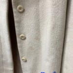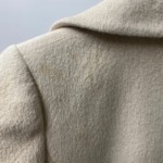 保管中に出てきたシミ抜き事例です。 クリーニングして保管されていたそうですが、数年たってから着用しようと思ったらシミが浮き出てしまったそうです。 これは、長期保管などの影響で空気中の酸素と、透明ではあっても残っているシミの成分が反応してしまう(酸化)ことが原因としてあげられます。 こうした場合でも、全体的に特殊な復元処理をすることで、元の状態に戻すことができます。
